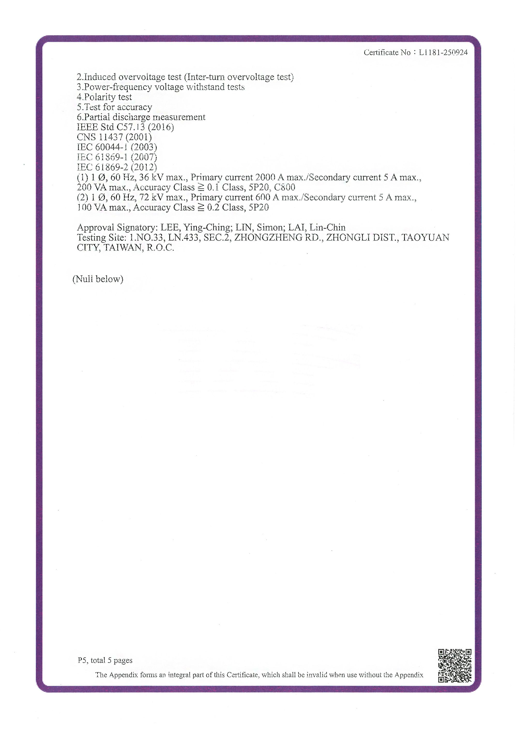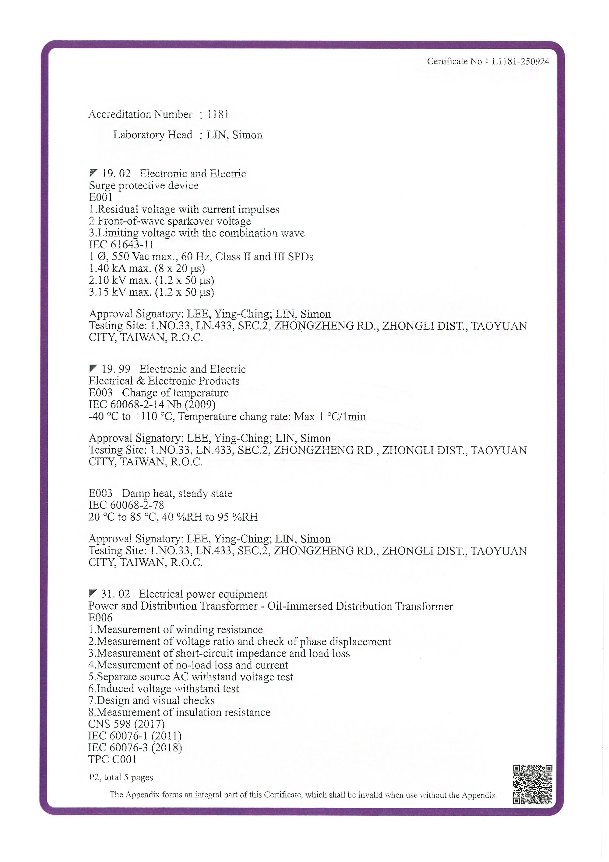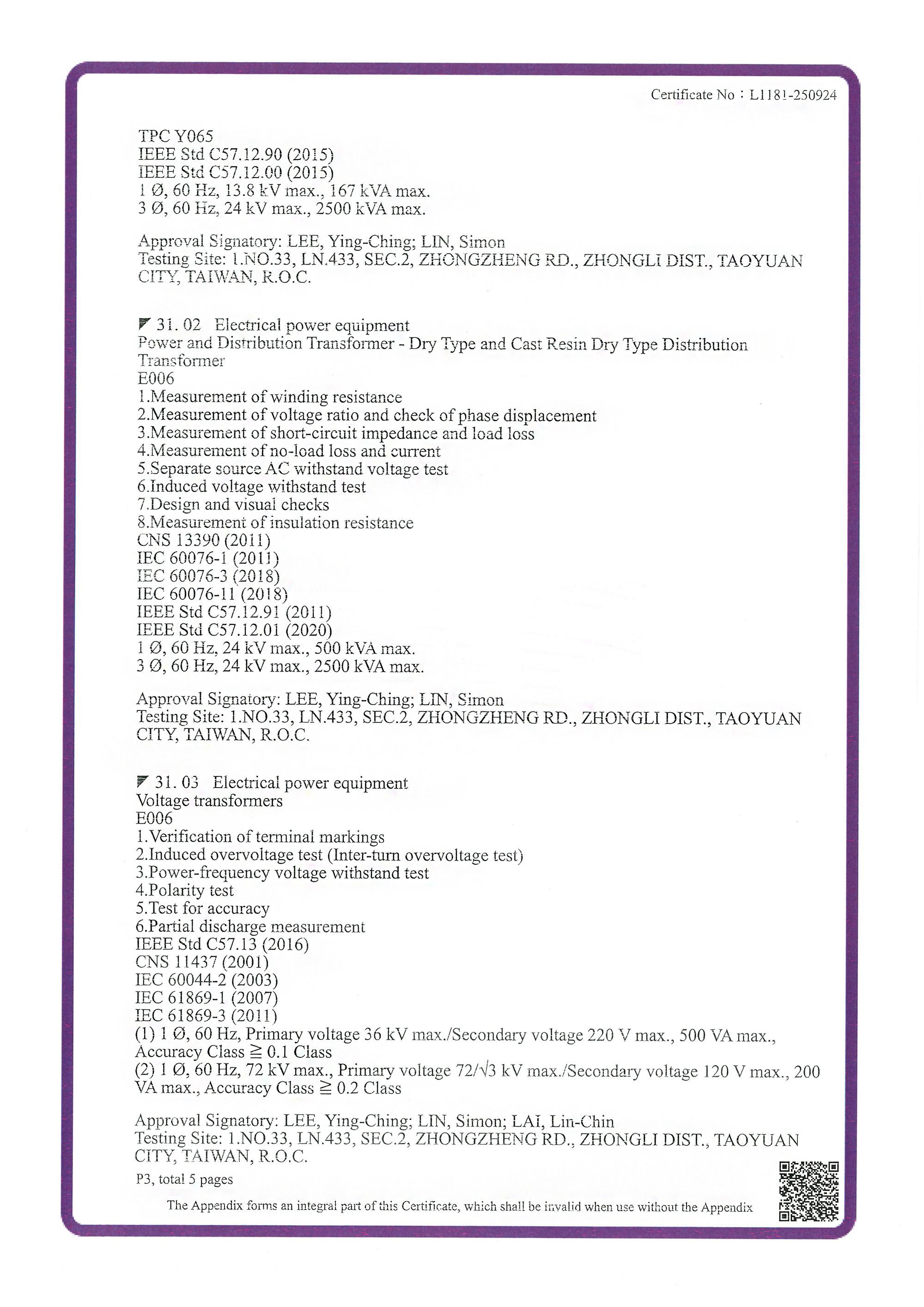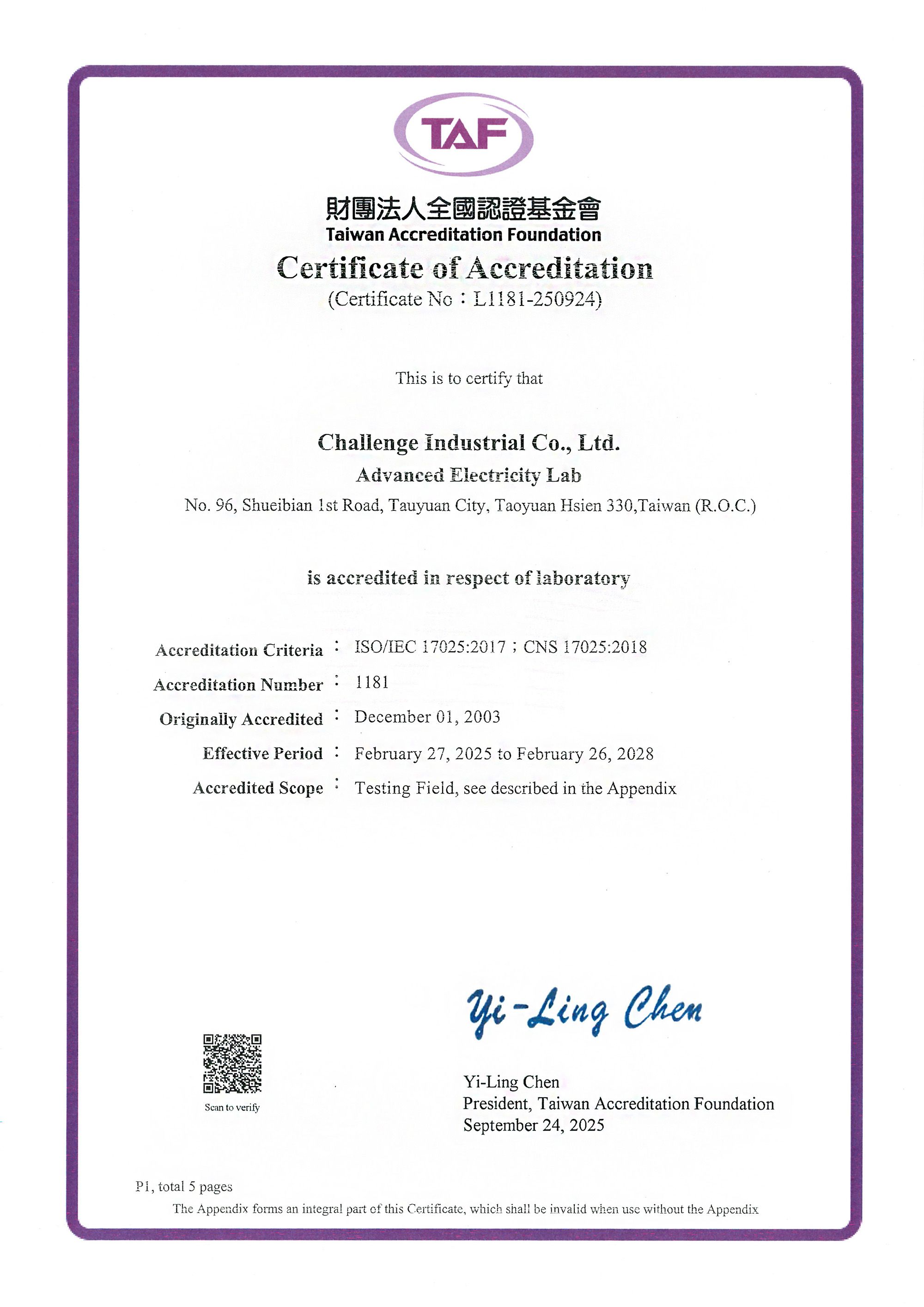 Certificado de Acreditación (Número de Certificado: L1181-250924), emitido a CIC's Laboratorio Avanzado de Electricidad* por la Fundación de Acreditación de Taiwán (TAF) - un miembro de ILAC y signatario del MRA de ILAC - en relación con el siguiente campo de pruebas (Número de Acreditación: 1181; Criterios de Acreditación: ISO/IEC 17025:2017; CNS 17025:2018):